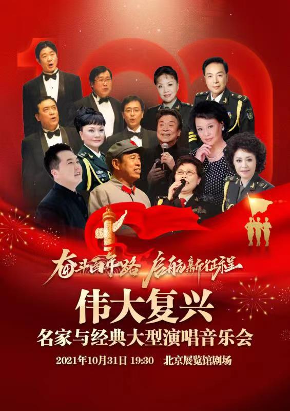一首歌铭刻一段历史,一首歌绽放一种情怀。奋斗百年路 启航新征程:伟大复兴——名家与经典大型演唱音乐会将邀请原总政歌舞团及活跃在当代艺术舞台上的歌唱家们,于10月31日在北京展览馆剧场为大家带来耳熟能详的经典名曲,为建党100年送上真诚的祝福。